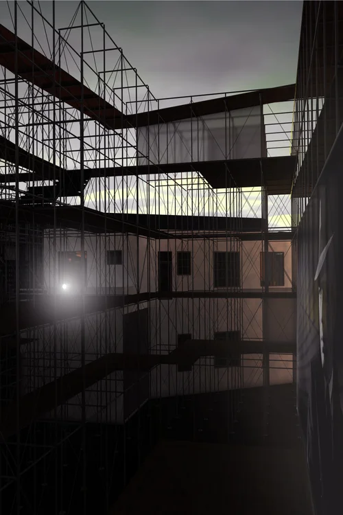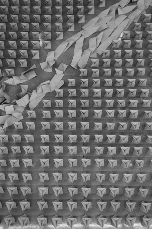 The process for this geometric installation included arrangement, disruption, and the displacement of the established grid. To exhibit the 'front' in Iowa, the displaced grid condition is constructed and represented through a transportable, repeatable, cardboard unit. The unit is crafted in three sections with multi-directional scores, which allows the piece to twist into a three dimensional form as well as lay flat for transportation efficiency. Upon completion in Ames, the process of disassembling, packing, and transport of the installation to bring to Venice began. To do so, the units were packed into carry-on suitcases and flown across the Atlantic. Each of the twenty-eight students that traveled to Venice from Iowa brought 25-50 pieces with them, for a total of around 900 units for the installation in Venice.